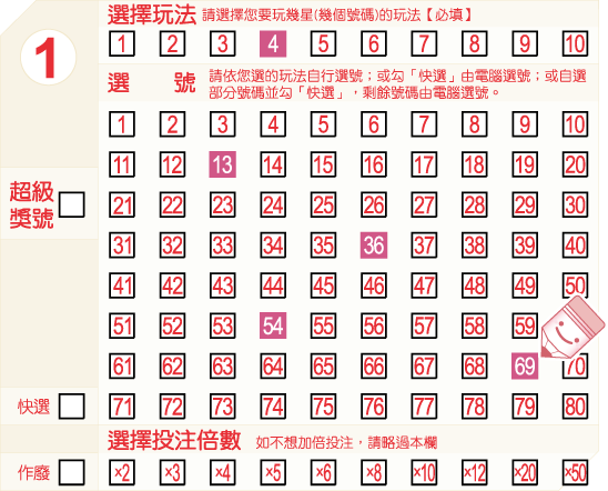 在選號區中,自行從01~80的號碼中填選與您的玩法相對應個數之號碼進行投注。例如,如果您要玩「4星」玩法,則您必須在選號區內填選四個號碼。